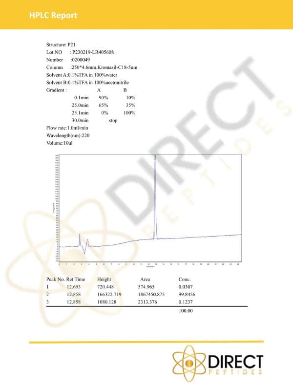 Buy P-21 peptide with 99% purity from Direct Peptides, designed specifically for scientific research. Each product is third party tested to ensure high quality and reliability, giving researchers confidence in their results. Count on our peptides for safety, precision, and consistent support in advancing your research.